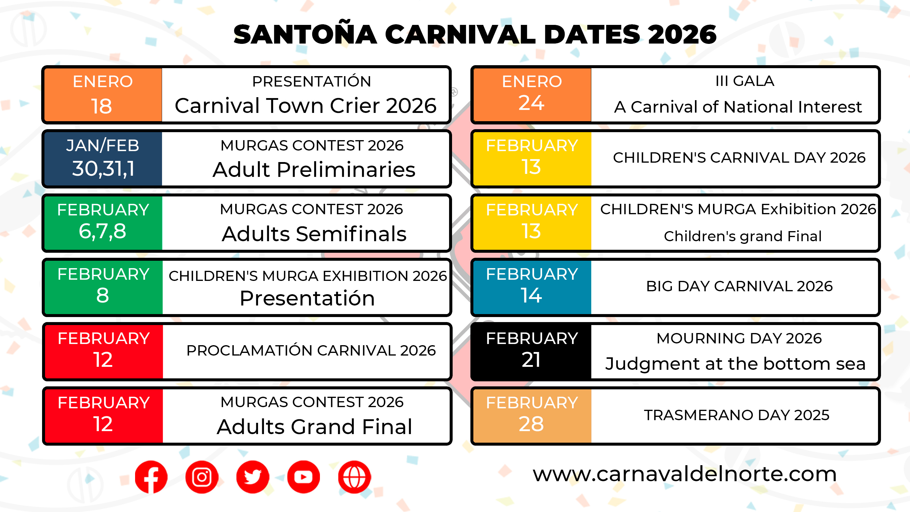 These will be the dates of the Santoña Carnival 2026, starting on January 18 with the presentation of the 2026 Carnival Town Crier, and running until February 28, with Trasmerano Day.